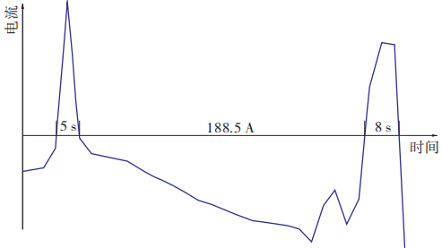 堵轉(zhuǎn)保護(hù)功能的主要特點(diǎn)是可以在電動(dòng)機(jī)啟動(dòng)完成后再投入,因此,可以不用考慮啟動(dòng)的影響。如果將4#入窯提升機(jī)堵轉(zhuǎn)保護(hù)電流定值改為200A,時(shí)間定值改為2s,那么此次故障有兩個(gè)電流波峰均可以啟動(dòng)保護(hù)動(dòng)作。一次超過200A電流持續(xù)時(shí)間為4s,二次超過200A電流持續(xù)時(shí)間為6s,見圖5。