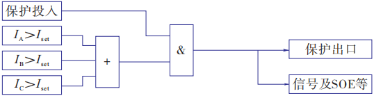 過載保護(hù)是針對電動(dòng)機(jī)電流超過電動(dòng)機(jī)負(fù)載能力,且經(jīng)過一定延時(shí)再啟動(dòng)的保護(hù)動(dòng)作,其動(dòng)作邏輯見圖2,