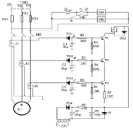 若由于某種原因造成三相電源中任一相斷相時(shí), 則該相電壓信號為零, 相應(yīng)的晶體管將截止, 使繼電器 K 和交流接觸器均釋放, 切斷電動(dòng)機(jī) M 的工作電源, 從而保護(hù)電動(dòng)機(jī)不會(huì)因缺一相電源, 變成兩相運(yùn)行, 過熱而損壞。